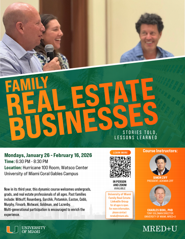 Now in its third year, this dynamic course welcomes undergrads, grads, and real estate professionals of all ages. Past families include: Witkoff, Rosenberg, Garchik, Potamkin, Easton, Cobb, Murphy, Finvarb, Motwani, Goldman, and Lazenby. Multi-generational participation is encouraged to enrich the experience.
